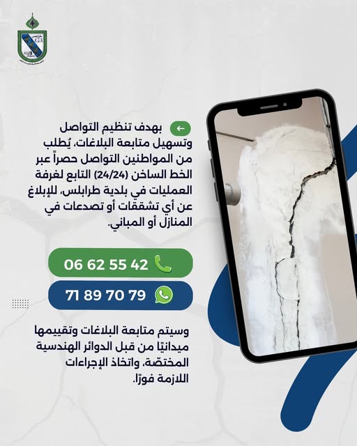 Home Blog تتلقى بلدية طرابلس منذ يوم أمس عددًا كبيرًا من الاتصالات من مواطنين يعبّرون عن قلقهم إزاء وجود تشققات وتصدعات في منازلهم